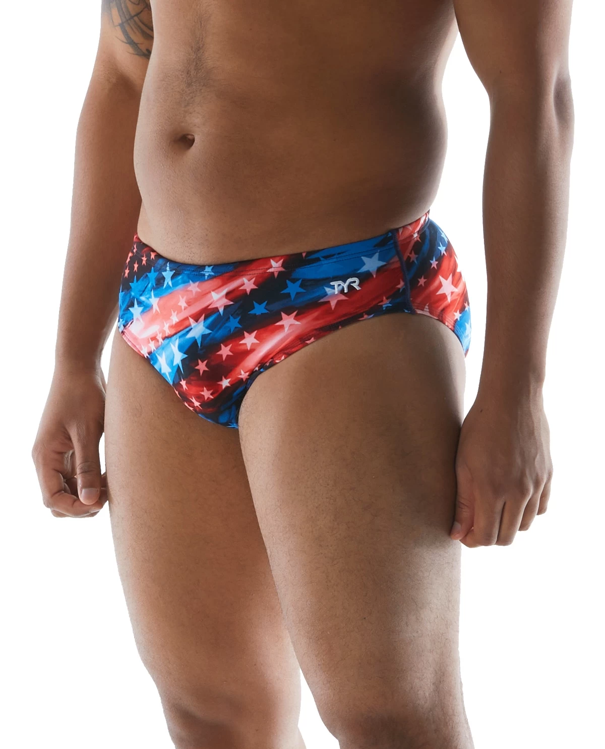 Take on every challenge in the TYR Men’s Freedom Flag Racer Swimsuit.